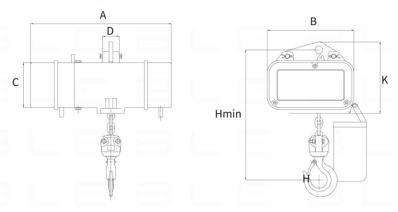 | Модель | Грузоподъемность(т) | Минимальная высотаHmin | Размер A(мм) | Размер B(мм) | Размер C(мм) | Размер D(мм) | Размер K(мм) |